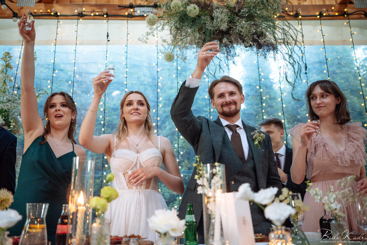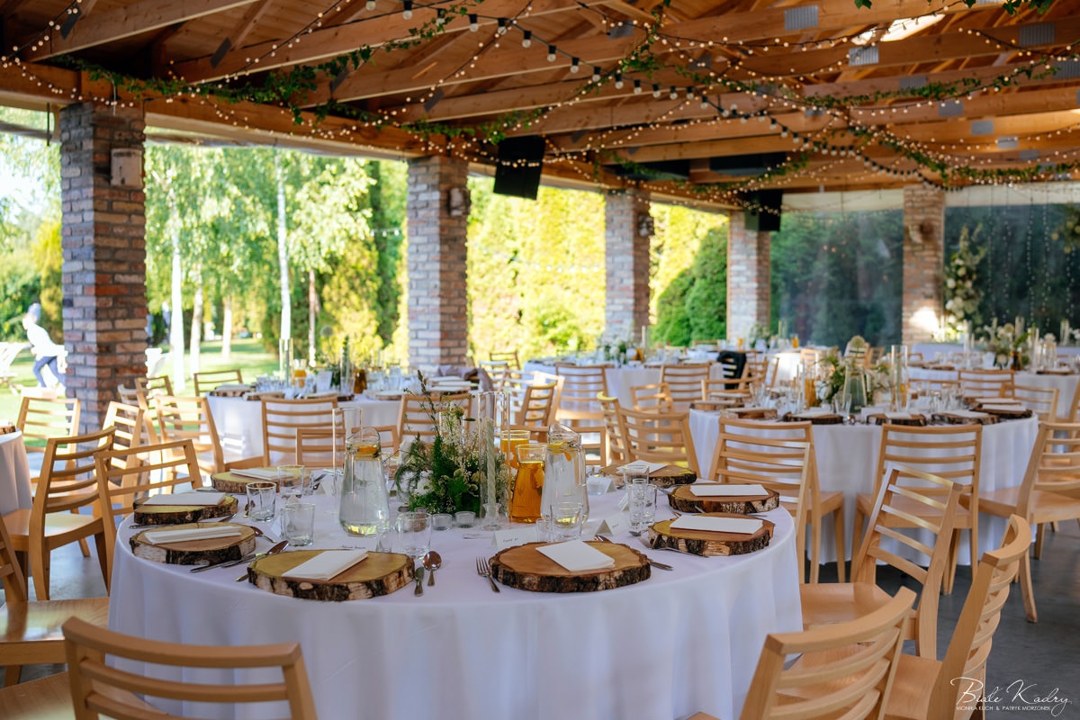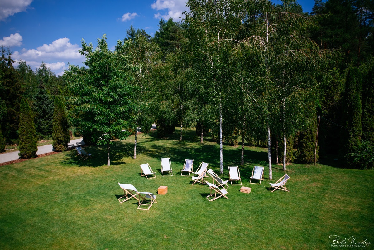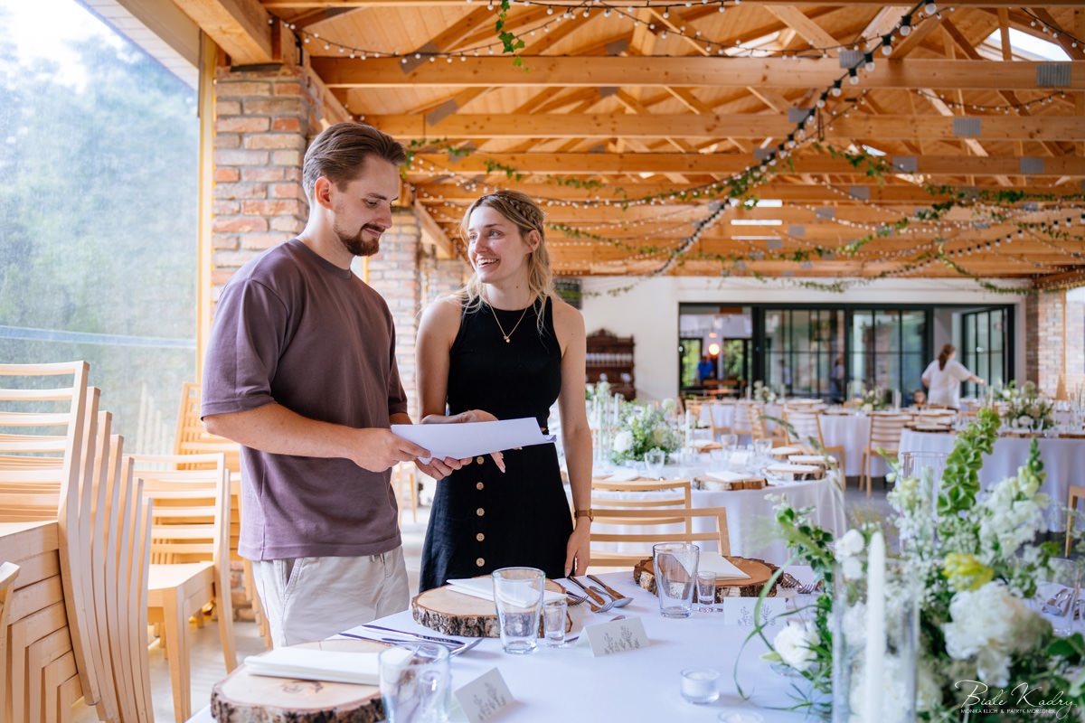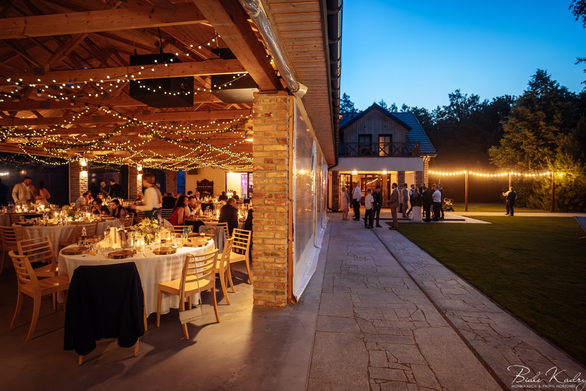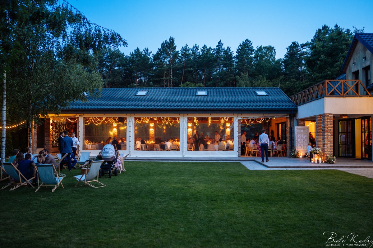 Kulinarna strona wesela to mistrzostwo – kreatywne przekąski i smaczne dania zachwycają zarówno smakiem, jak i artystycznym podaniem. Obsługa jest na najwyższym poziomie – uśmiechnięta, profesjonalna i zawsze gotowa, by spełnić oczekiwania Gości. Sala weselna jest pięknie zaaranżowana, z dbałością o najmniejsze detale, a oświetlenie i dekoracje tworzą magiczny nastrój.  Parkiet zachęca do tańca do białego rana, a muzyka w połączeniu z niezwykłą atmosferą sprawia, że nikt nie chce opuszczać tego miejsca. Ogromnie podoba nam się również rozwiązanie z miejscem przed salą weselną i miejscem ze stołami: Goście weselni mogą miło spędzić czas w strefie z leżakami, pośród drzew.