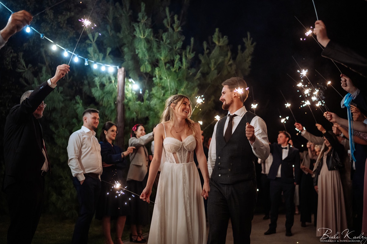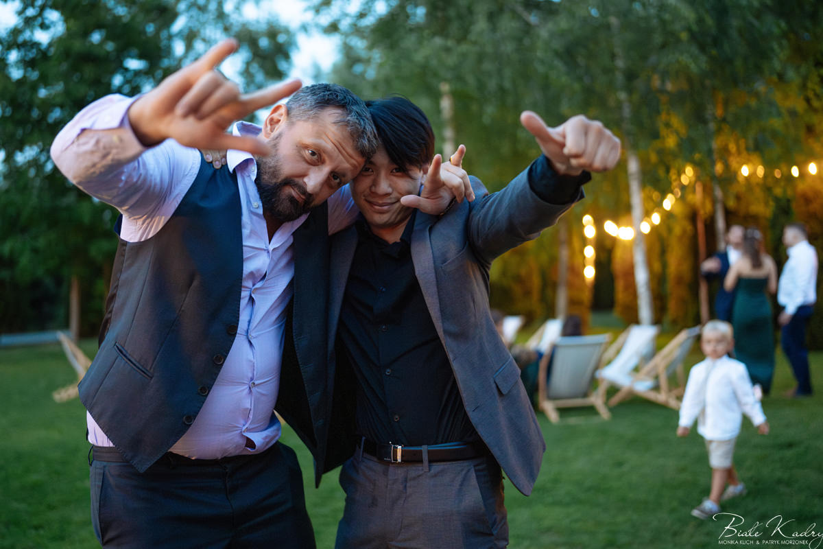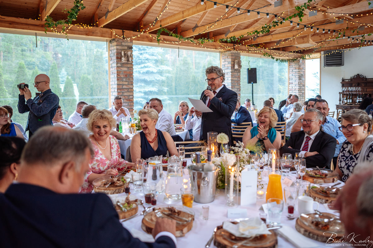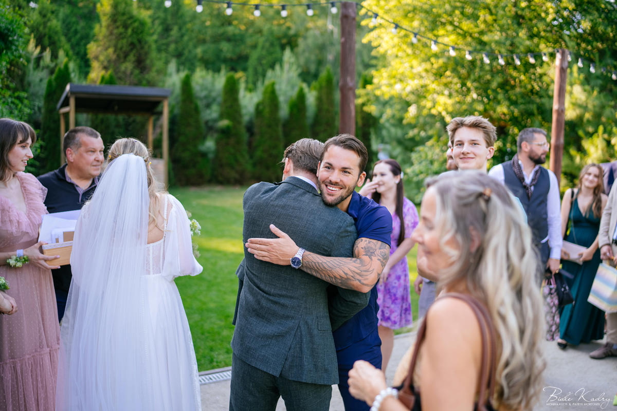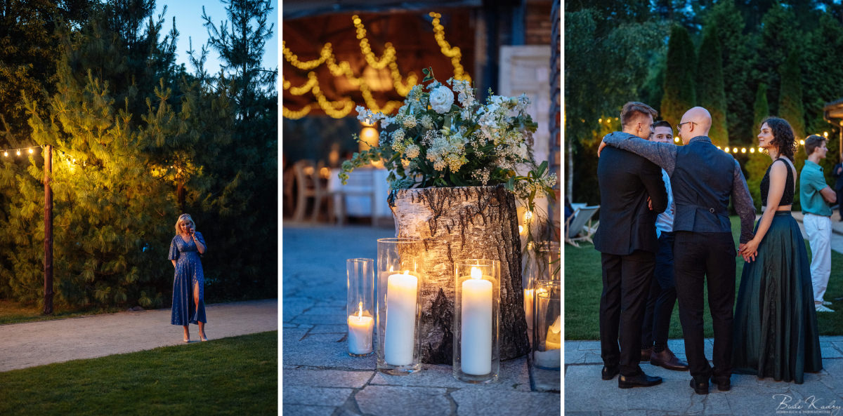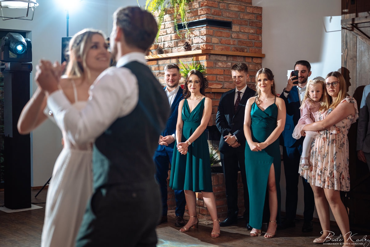 Kulinarna strona wesela to mistrzostwo – kreatywne przekąski i smaczne dania zachwycają zarówno smakiem, jak i artystycznym podaniem. Obsługa jest na najwyższym poziomie – uśmiechnięta, profesjonalna i zawsze gotowa, by spełnić oczekiwania Gości. Sala weselna jest pięknie zaaranżowana, z dbałością o najmniejsze detale, a oświetlenie i dekoracje tworzą magiczny nastrój.  Parkiet zachęca do tańca do białego rana, a muzyka w połączeniu z niezwykłą atmosferą sprawia, że nikt nie chce opuszczać tego miejsca. Ogromnie podoba nam się również rozwiązanie z miejscem przed salą weselną i miejscem ze stołami: Goście weselni mogą miło spędzić czas w strefie z leżakami, pośród drzew.