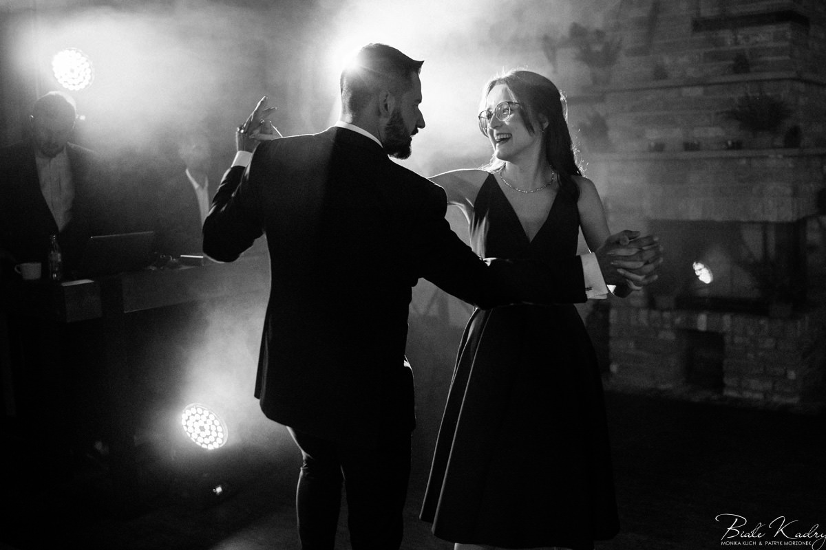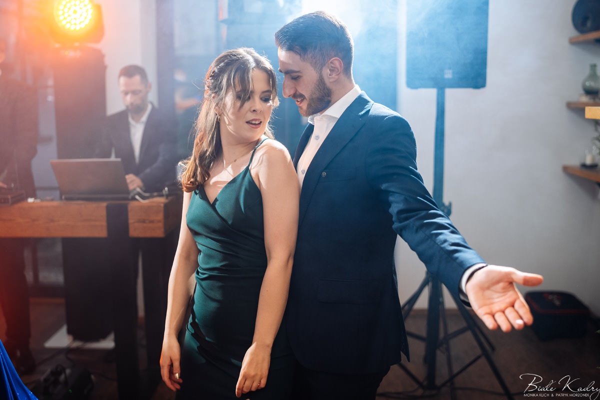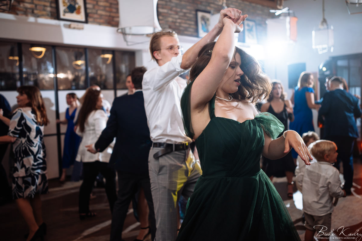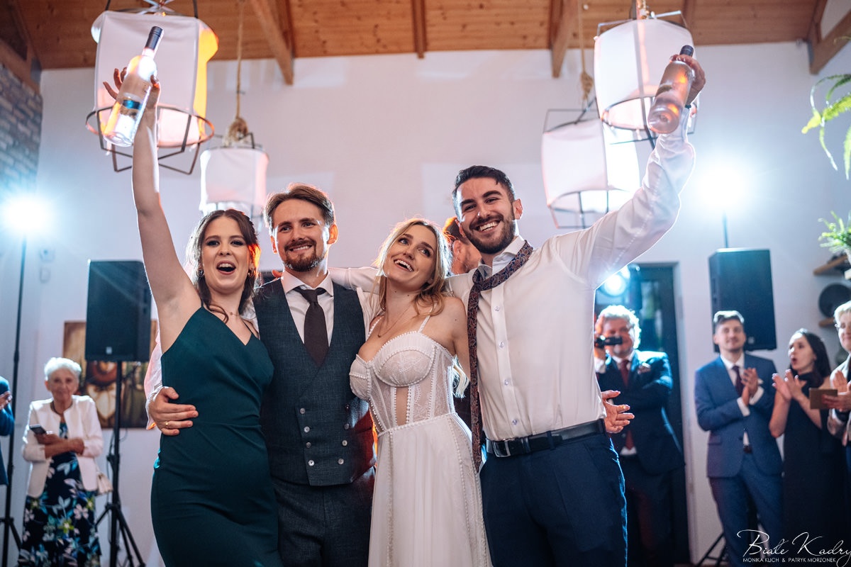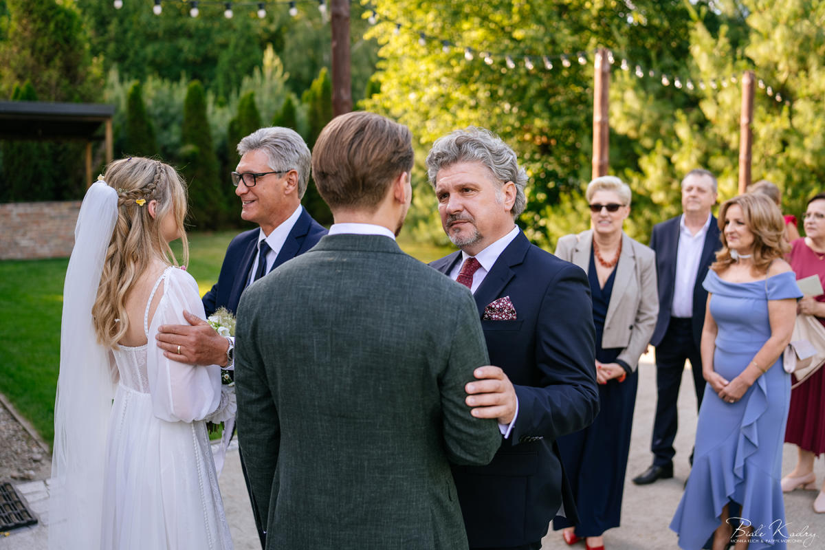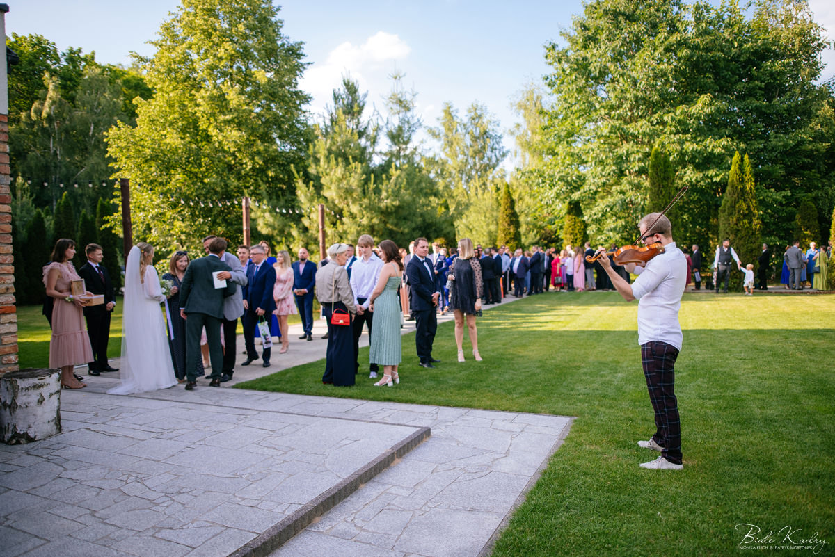 Kulinarna strona wesela to mistrzostwo – kreatywne przekąski i smaczne dania zachwycają zarówno smakiem, jak i artystycznym podaniem. Obsługa jest na najwyższym poziomie – uśmiechnięta, profesjonalna i zawsze gotowa, by spełnić oczekiwania Gości. Sala weselna jest pięknie zaaranżowana, z dbałością o najmniejsze detale, a oświetlenie i dekoracje tworzą magiczny nastrój.  Parkiet zachęca do tańca do białego rana, a muzyka w połączeniu z niezwykłą atmosferą sprawia, że nikt nie chce opuszczać tego miejsca. Ogromnie podoba nam się również rozwiązanie z miejscem przed salą weselną i miejscem ze stołami: Goście weselni mogą miło spędzić czas w strefie z leżakami, pośród drzew.