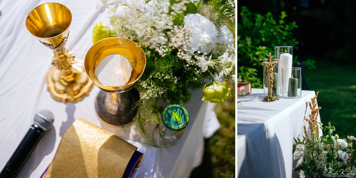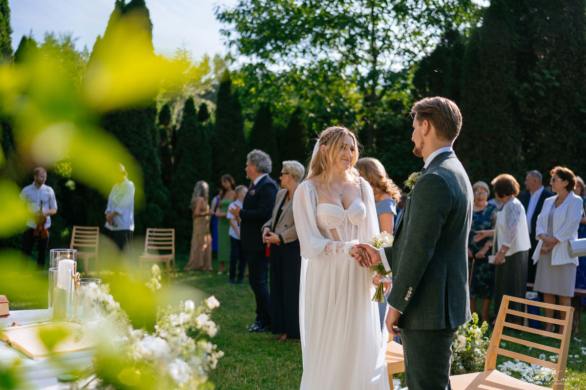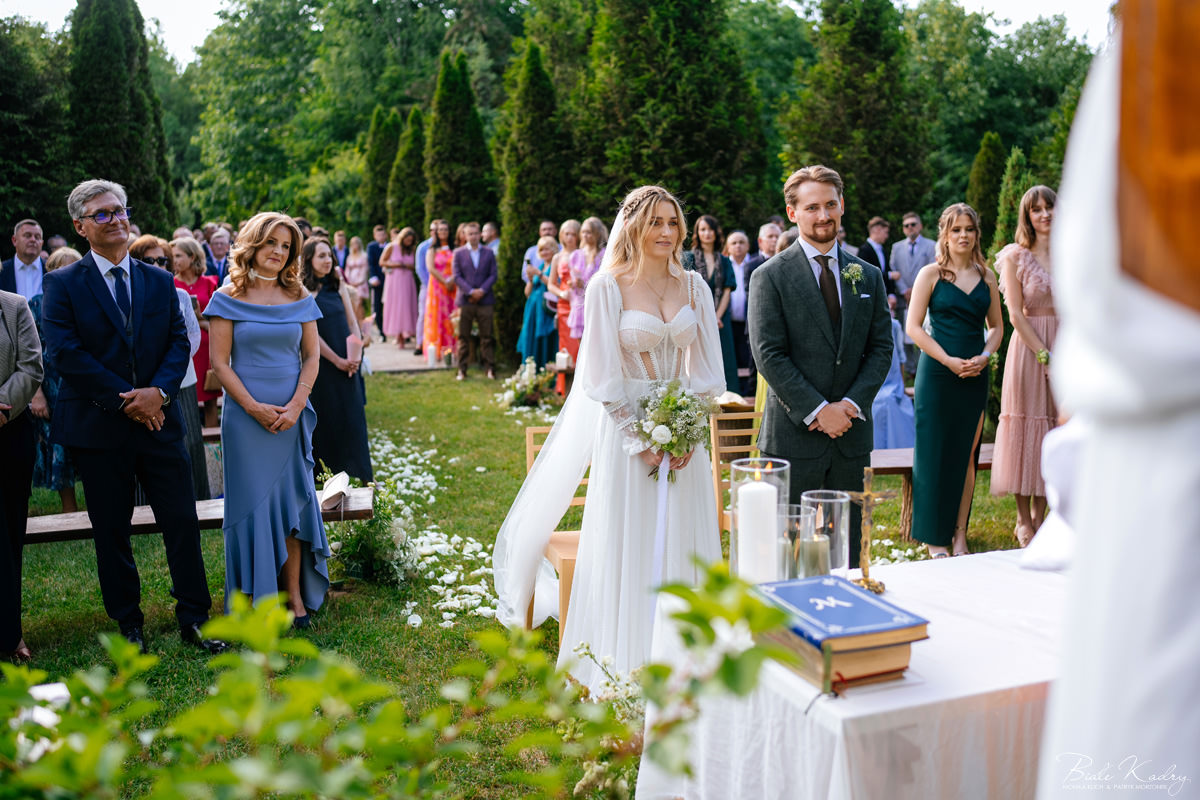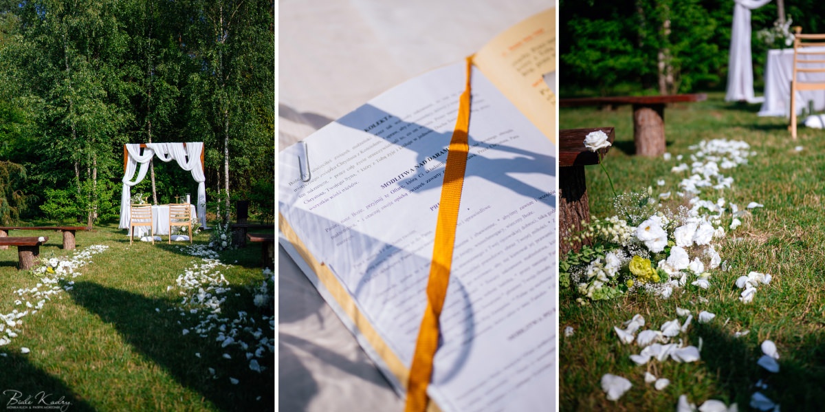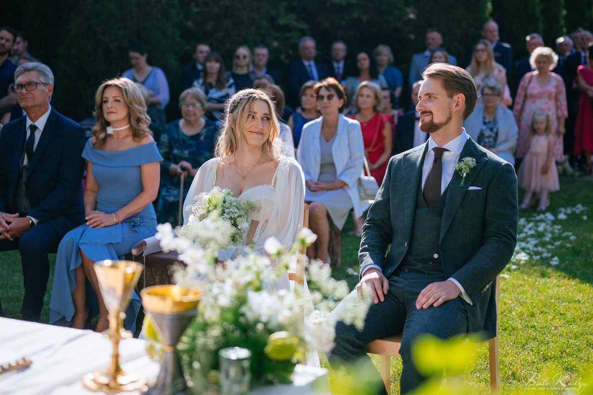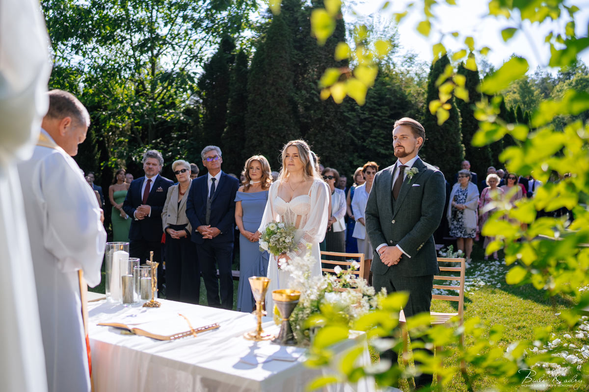 To dla nas, jako duetu fotografów ślubnych, wyjątkowa okazja do uchwycenia magii natury i duchowej głębi uroczystości. Gra światła słonecznego, delikatny powiew wiatru i otaczająca przyroda tworzą niepowtarzalne tło dla każdej fotografii. Przepiękne detale, jak kwiatowe dekoracje czy ołtarz wśród drzew, dodają romantyzmu każdemu kadrowi. Zdjęcia wręcz przenoszą nas w magiczną atmosferę ślubu. Bardzo lubimy, gdy Pary Młode mają odwagę korzystać z piękna natury i pogody – chociaż ta bywa w Polsce dość kłopotliwa, to często mimo wszystko rozpieszcza nas cudownym światłem, złotą godziną i delikatnymi powiewami wiatru: wszystkim tym co fotografowie bardzo kochają :)