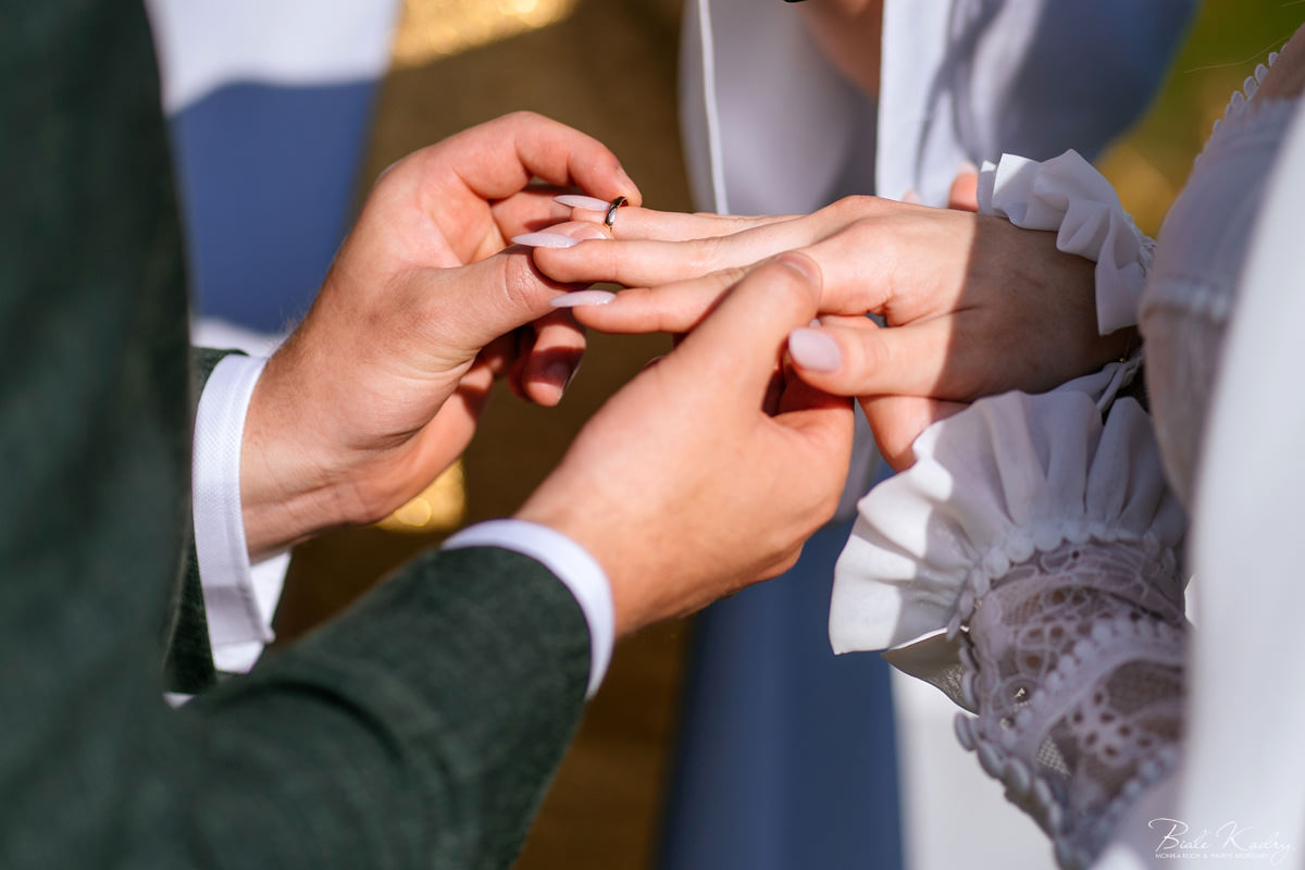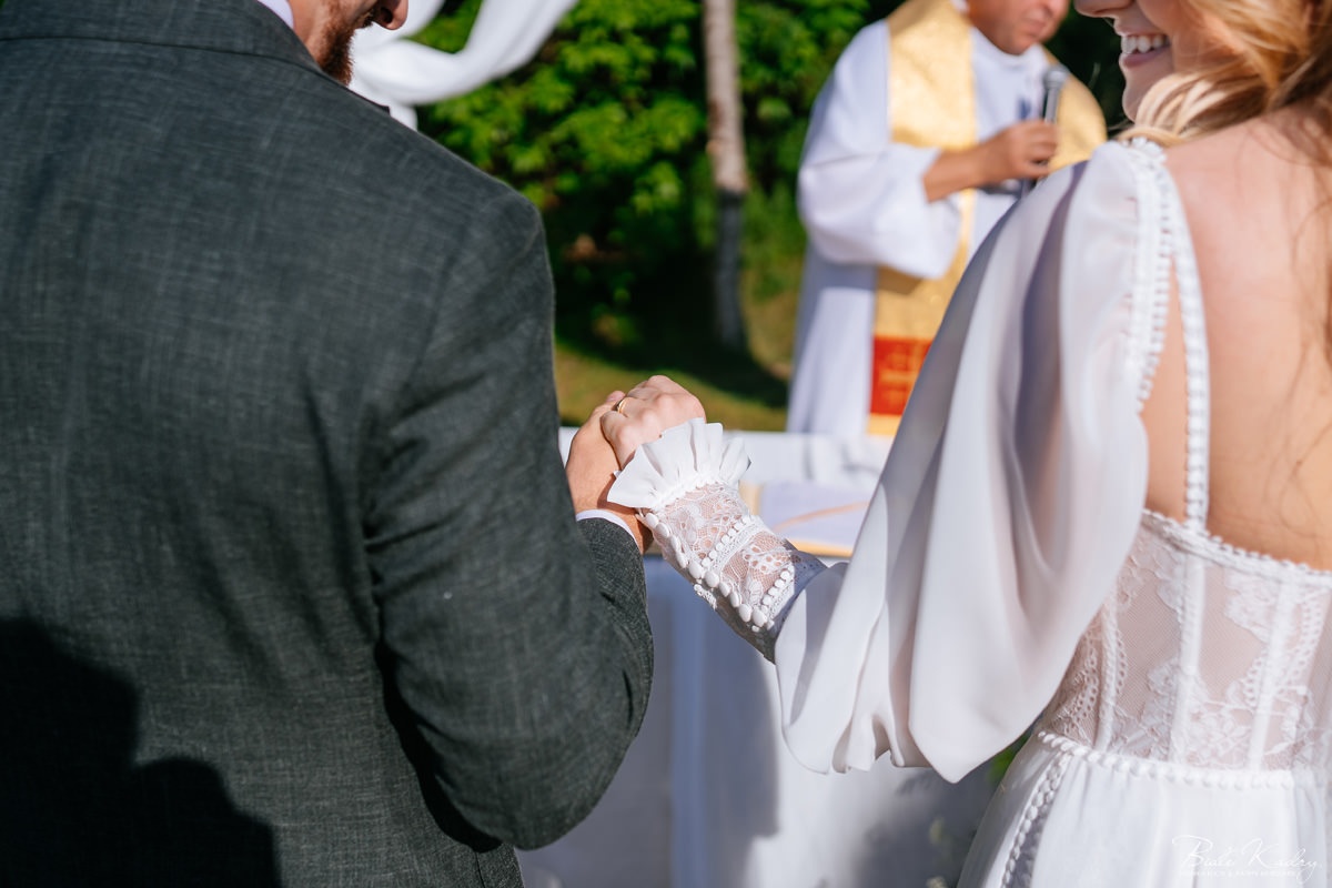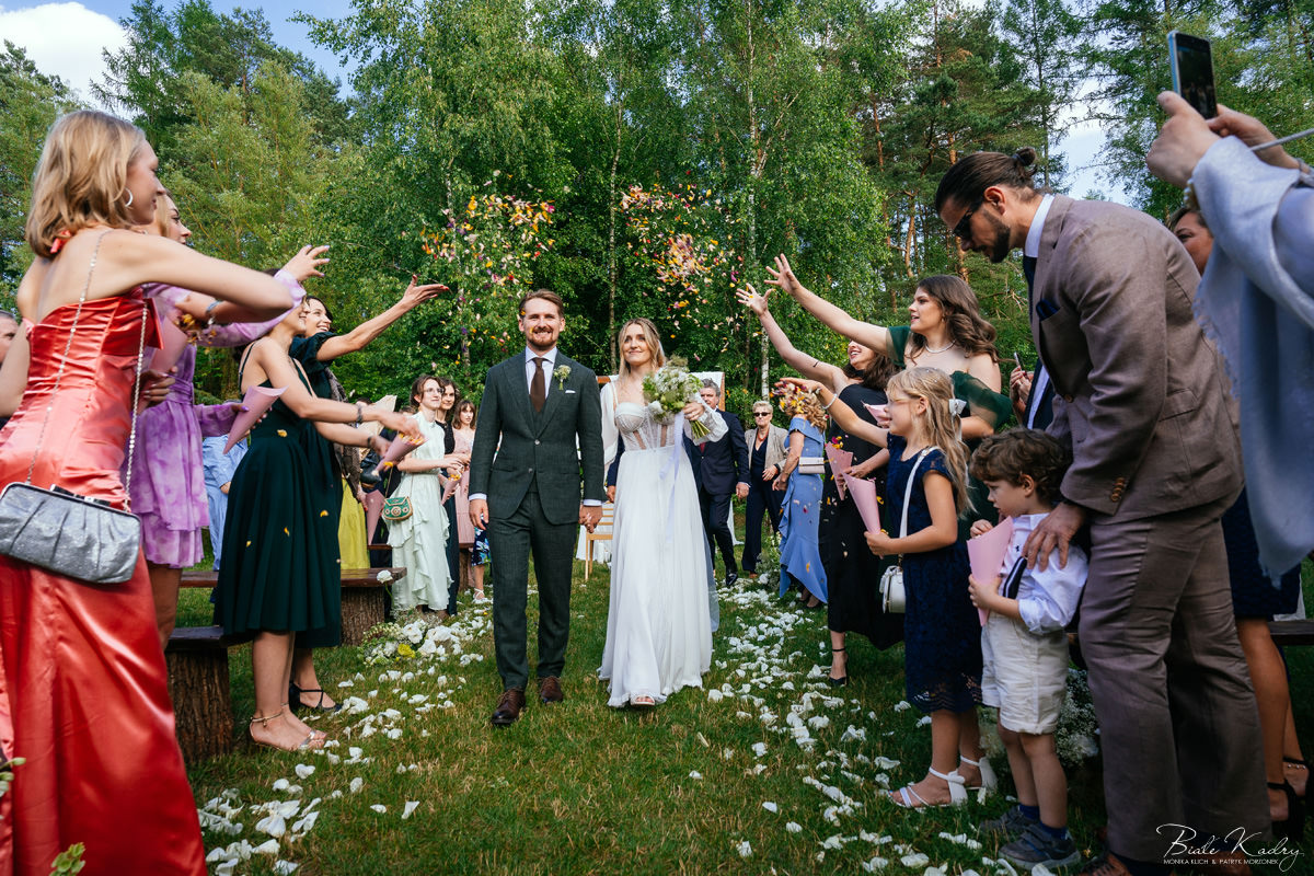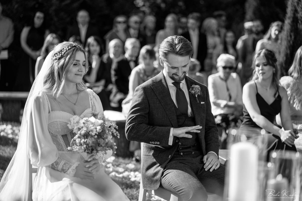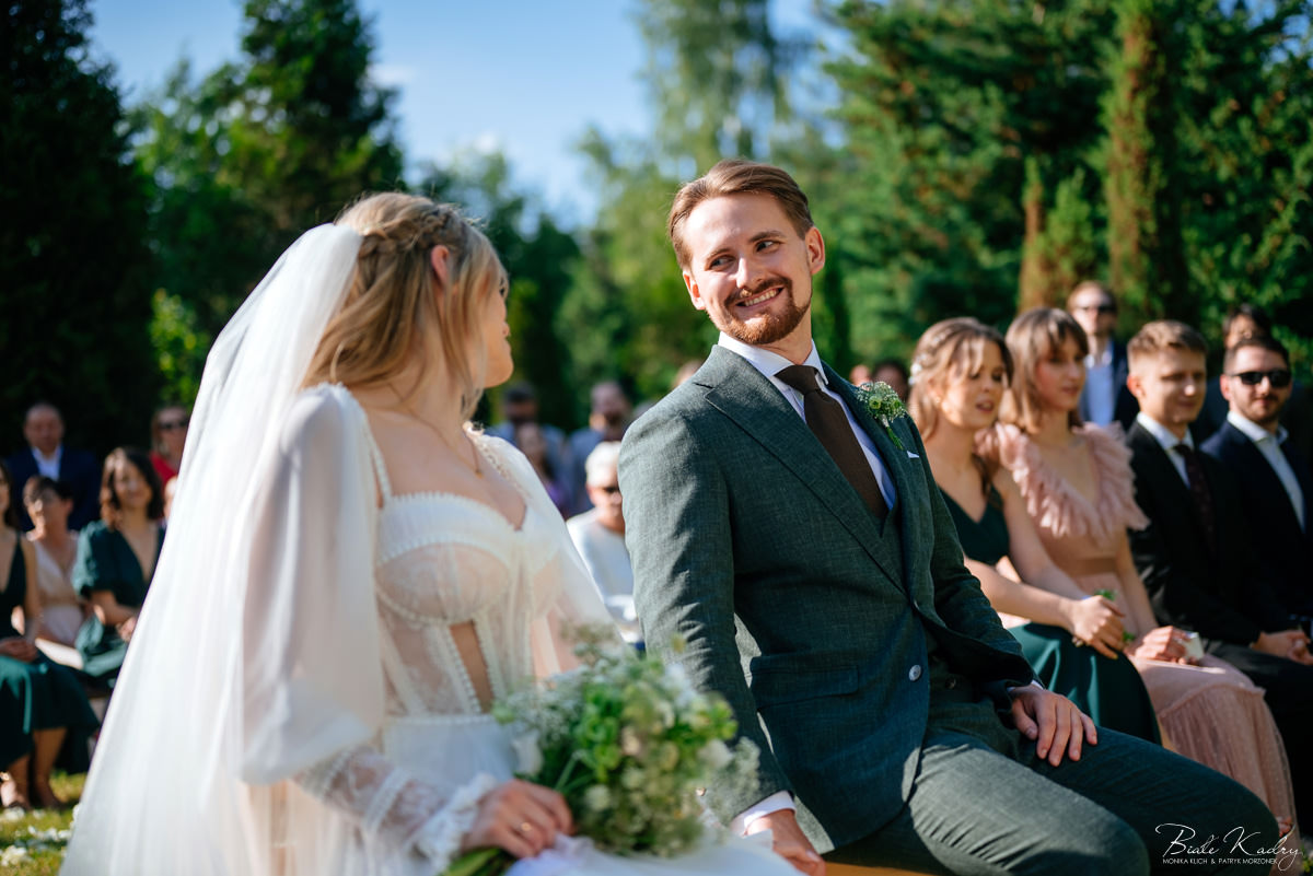 To dla nas, jako duetu fotografów ślubnych, wyjątkowa okazja do uchwycenia magii natury i duchowej głębi uroczystości. Gra światła słonecznego, delikatny powiew wiatru i otaczająca przyroda tworzą niepowtarzalne tło dla każdej fotografii. Przepiękne detale, jak kwiatowe dekoracje czy ołtarz wśród drzew, dodają romantyzmu każdemu kadrowi. Zdjęcia wręcz przenoszą nas w magiczną atmosferę ślubu. Bardzo lubimy, gdy Pary Młode mają odwagę korzystać z piękna natury i pogody – chociaż ta bywa w Polsce dość kłopotliwa, to często mimo wszystko rozpieszcza nas cudownym światłem, złotą godziną i delikatnymi powiewami wiatru: wszystkim tym co fotografowie bardzo kochają :)