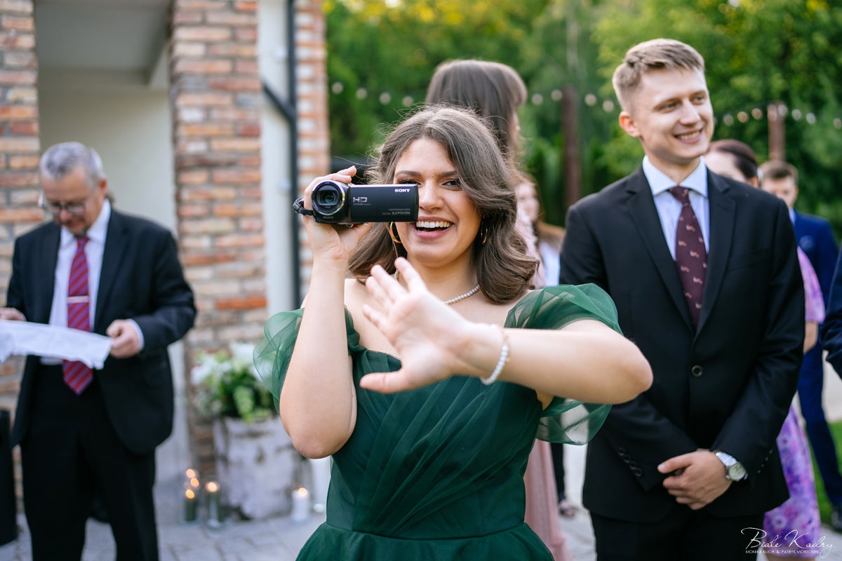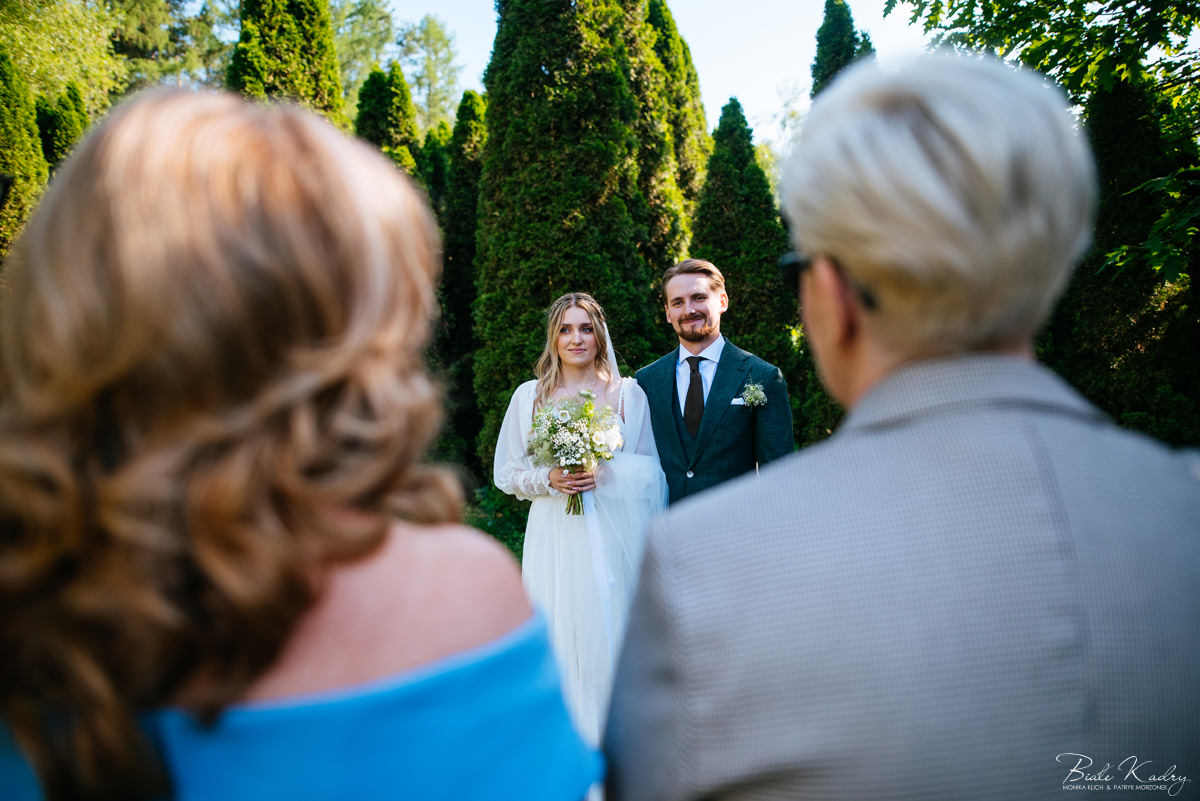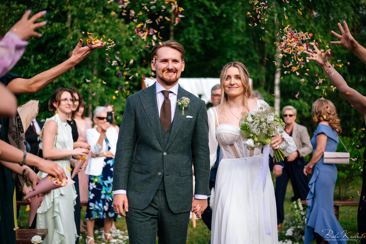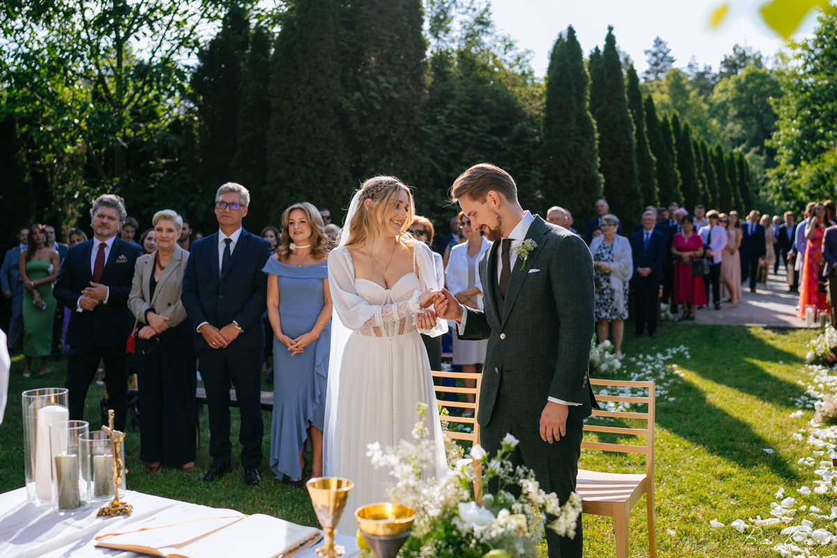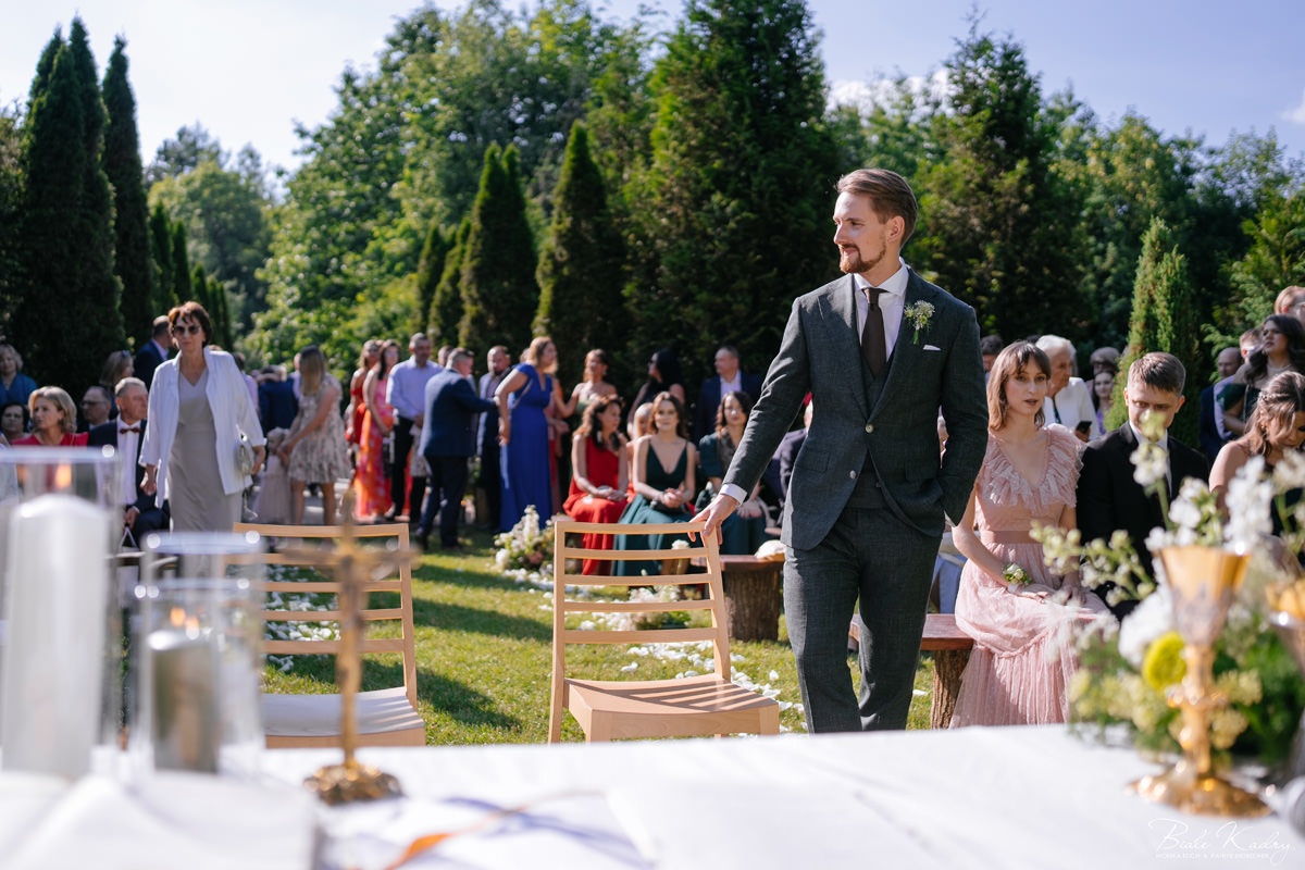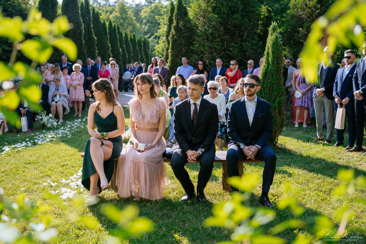 To dla nas, jako duetu fotografów ślubnych, wyjątkowa okazja do uchwycenia magii natury i duchowej głębi uroczystości. Gra światła słonecznego, delikatny powiew wiatru i otaczająca przyroda tworzą niepowtarzalne tło dla każdej fotografii. Przepiękne detale, jak kwiatowe dekoracje czy ołtarz wśród drzew, dodają romantyzmu każdemu kadrowi. Zdjęcia wręcz przenoszą nas w magiczną atmosferę ślubu. Bardzo lubimy, gdy Pary Młode mają odwagę korzystać z piękna natury i pogody – chociaż ta bywa w Polsce dość kłopotliwa, to często mimo wszystko rozpieszcza nas cudownym światłem, złotą godziną i delikatnymi powiewami wiatru: wszystkim tym co fotografowie bardzo kochają :)