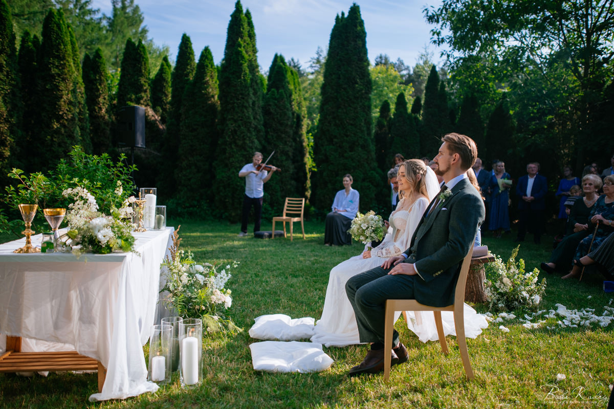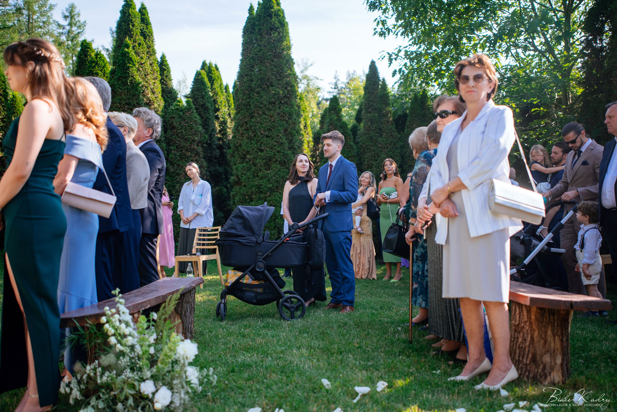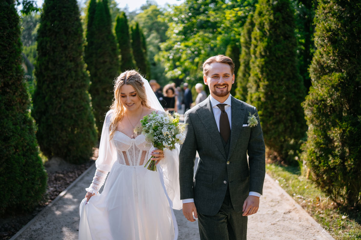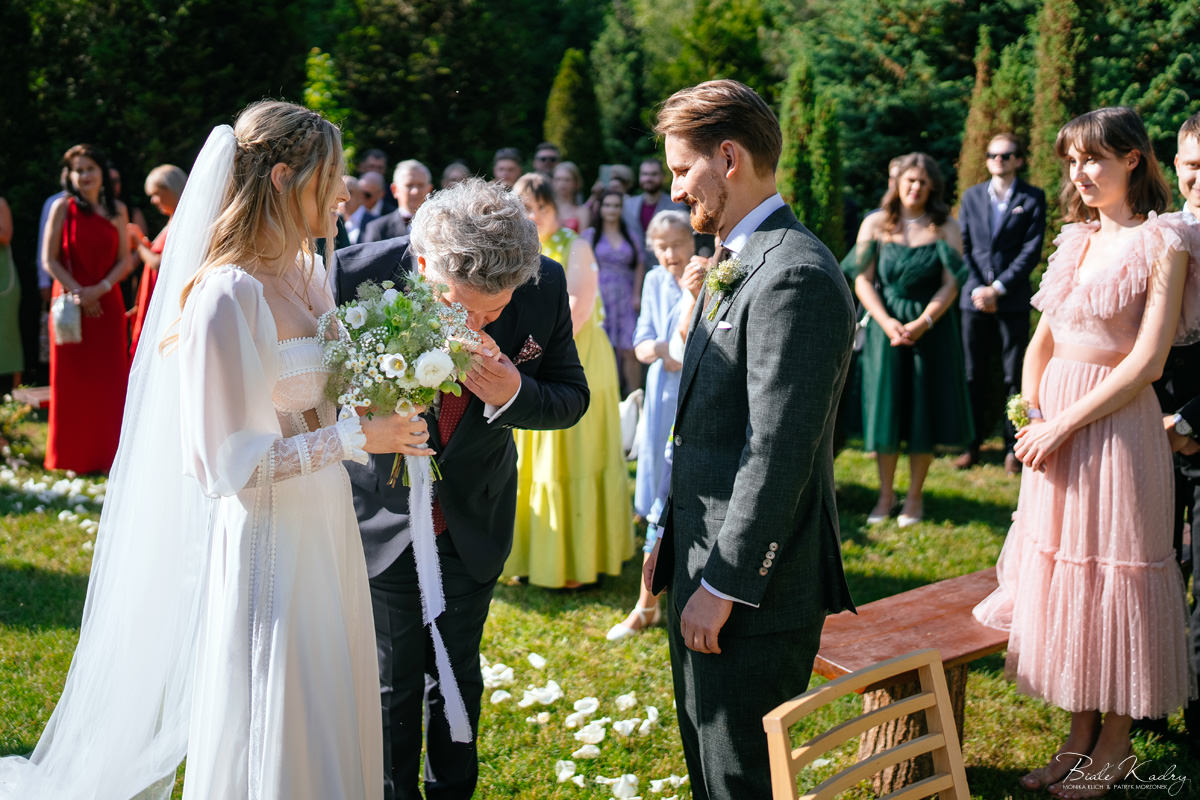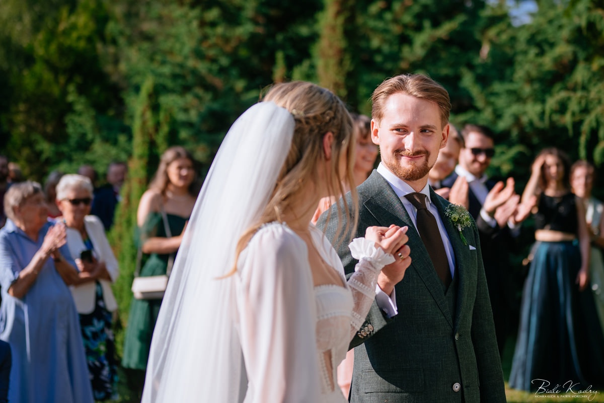To dla nas, jako duetu fotografów ślubnych, wyjątkowa okazja do uchwycenia magii natury i duchowej głębi uroczystości. Gra światła słonecznego, delikatny powiew wiatru i otaczająca przyroda tworzą niepowtarzalne tło dla każdej fotografii. Przepiękne detale, jak kwiatowe dekoracje czy ołtarz wśród drzew, dodają romantyzmu każdemu kadrowi. Zdjęcia wręcz przenoszą nas w magiczną atmosferę ślubu. Bardzo lubimy, gdy Pary Młode mają odwagę korzystać z piękna natury i pogody – chociaż ta bywa w Polsce dość kłopotliwa, to często mimo wszystko rozpieszcza nas cudownym światłem, złotą godziną i delikatnymi powiewami wiatru: wszystkim tym co fotografowie bardzo kochają :)