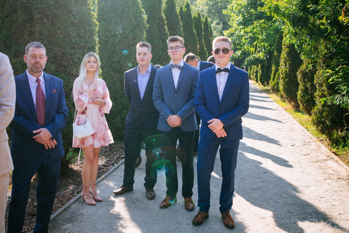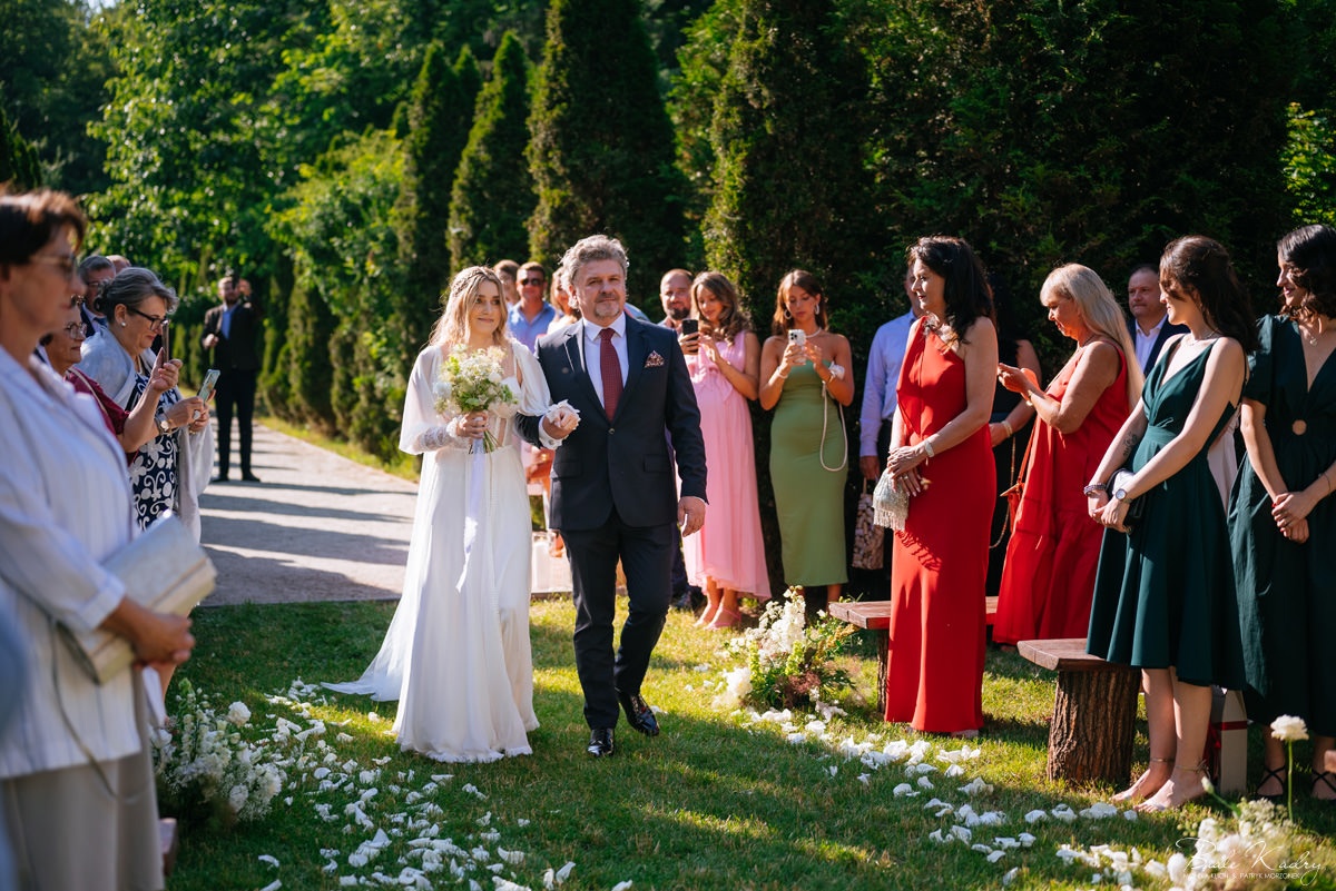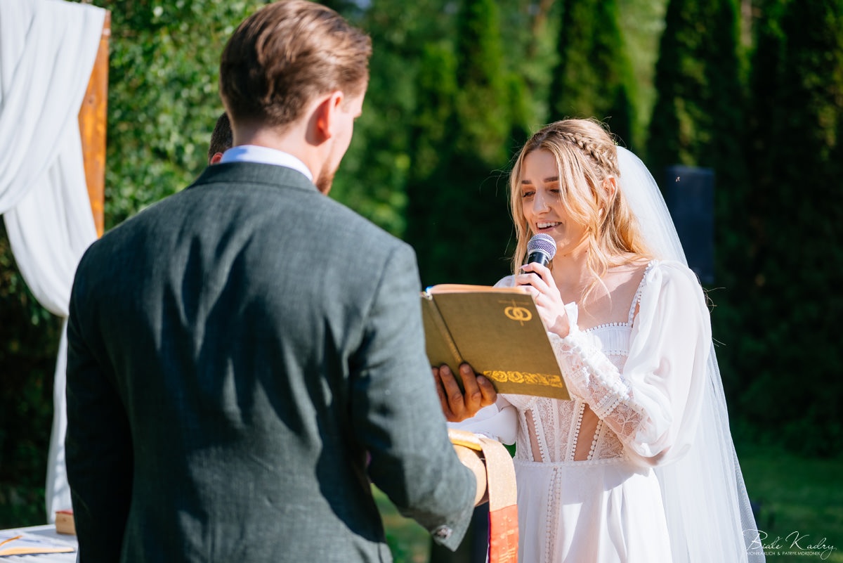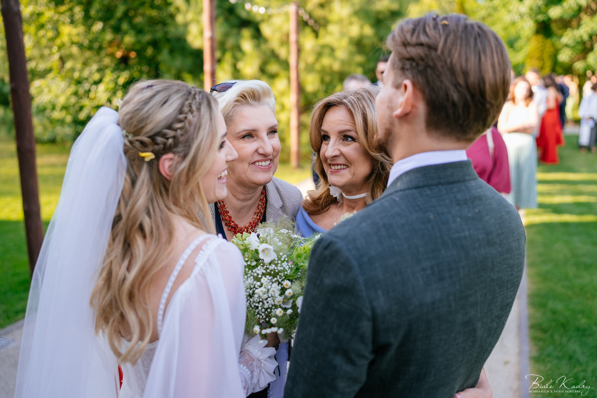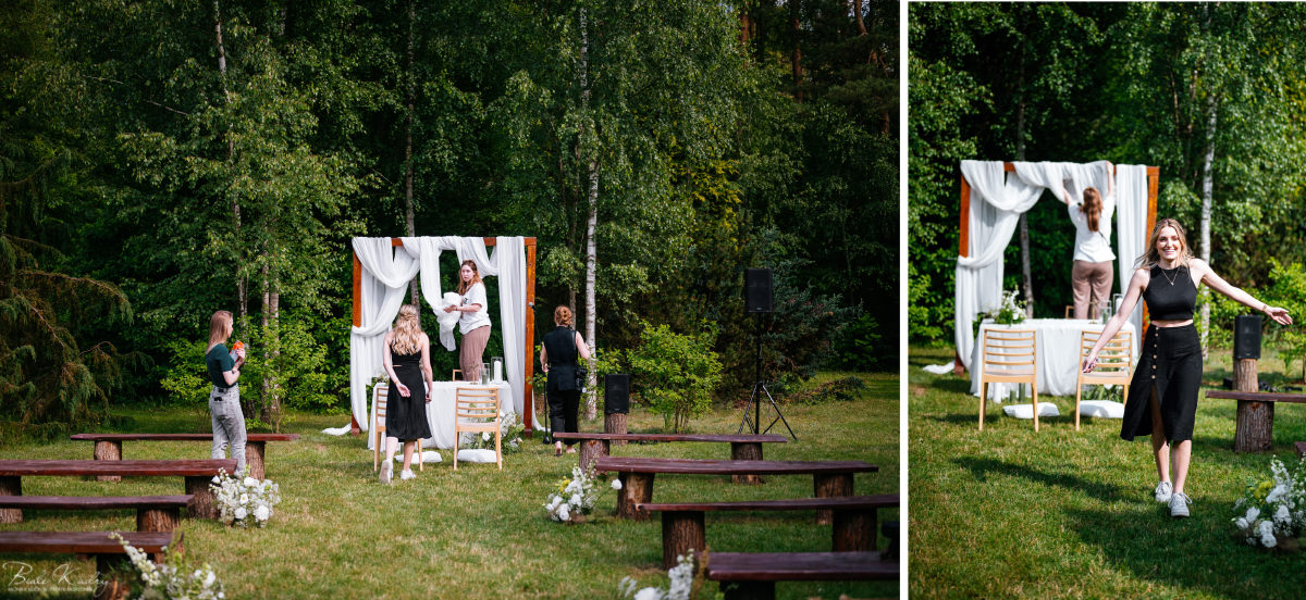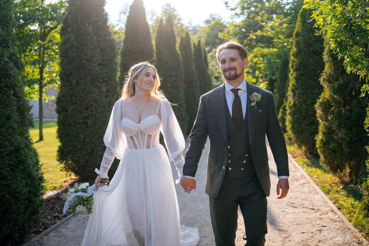 To dla nas, jako duetu fotografów ślubnych, wyjątkowa okazja do uchwycenia magii natury i duchowej głębi uroczystości. Gra światła słonecznego, delikatny powiew wiatru i otaczająca przyroda tworzą niepowtarzalne tło dla każdej fotografii. Przepiękne detale, jak kwiatowe dekoracje czy ołtarz wśród drzew, dodają romantyzmu każdemu kadrowi. Zdjęcia wręcz przenoszą nas w magiczną atmosferę ślubu. Bardzo lubimy, gdy Pary Młode mają odwagę korzystać z piękna natury i pogody – chociaż ta bywa w Polsce dość kłopotliwa, to często mimo wszystko rozpieszcza nas cudownym światłem, złotą godziną i delikatnymi powiewami wiatru: wszystkim tym co fotografowie bardzo kochają :)